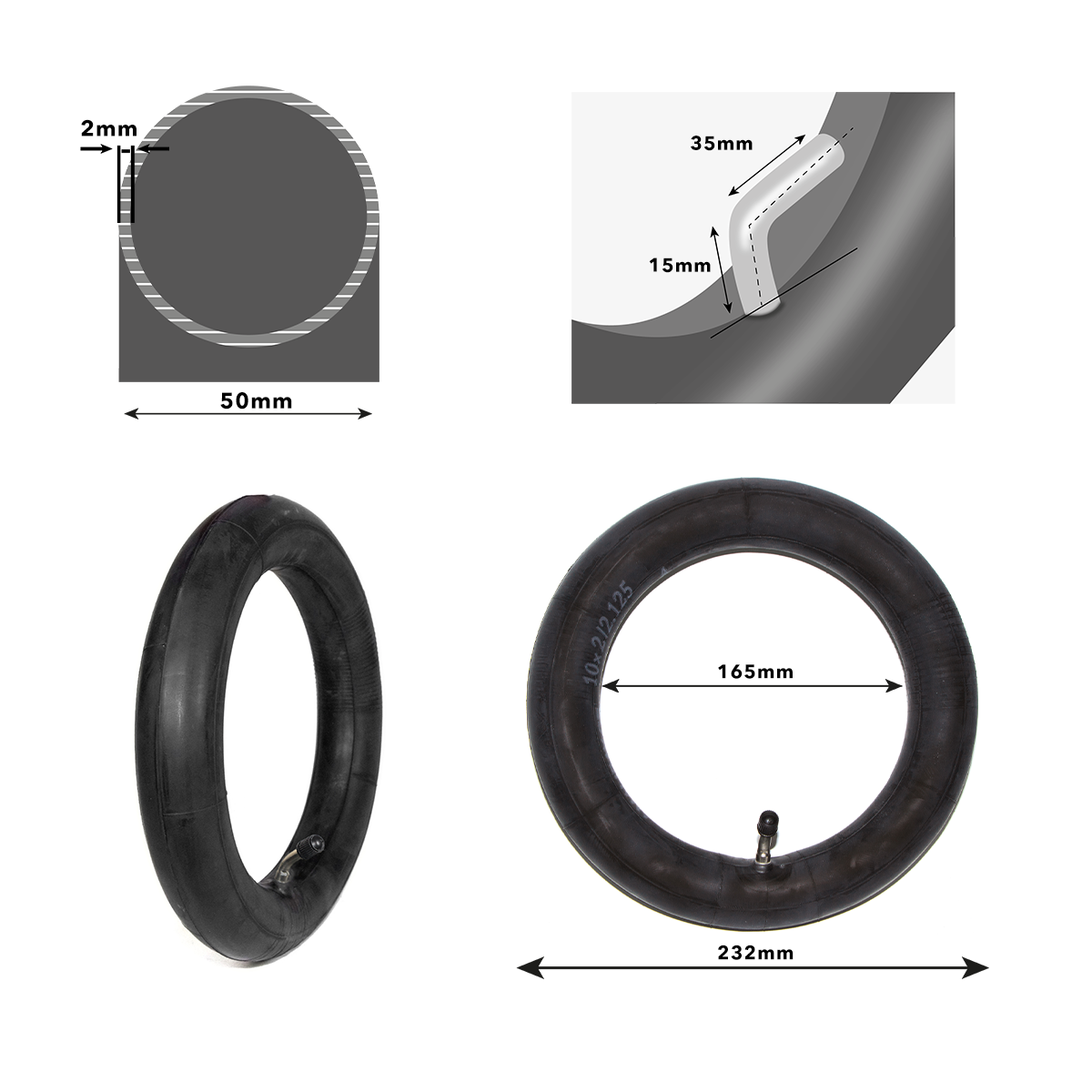 Cámaras de aire premium 10×2 válvula 45º 90º, exclusivas en Emove.  Fabricadas con caucho butílico de máxima calidad y un gramaje de 120 gramos. Estas cámaras ofrecen una durabilidad superior a otras marcas como Wanda. Caucho reforzado y doble refuerzo en el sellado de la válvula de aire. Se entregan empaquetadas en bolsas individualmente.