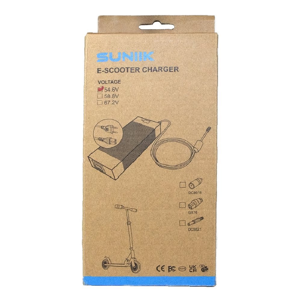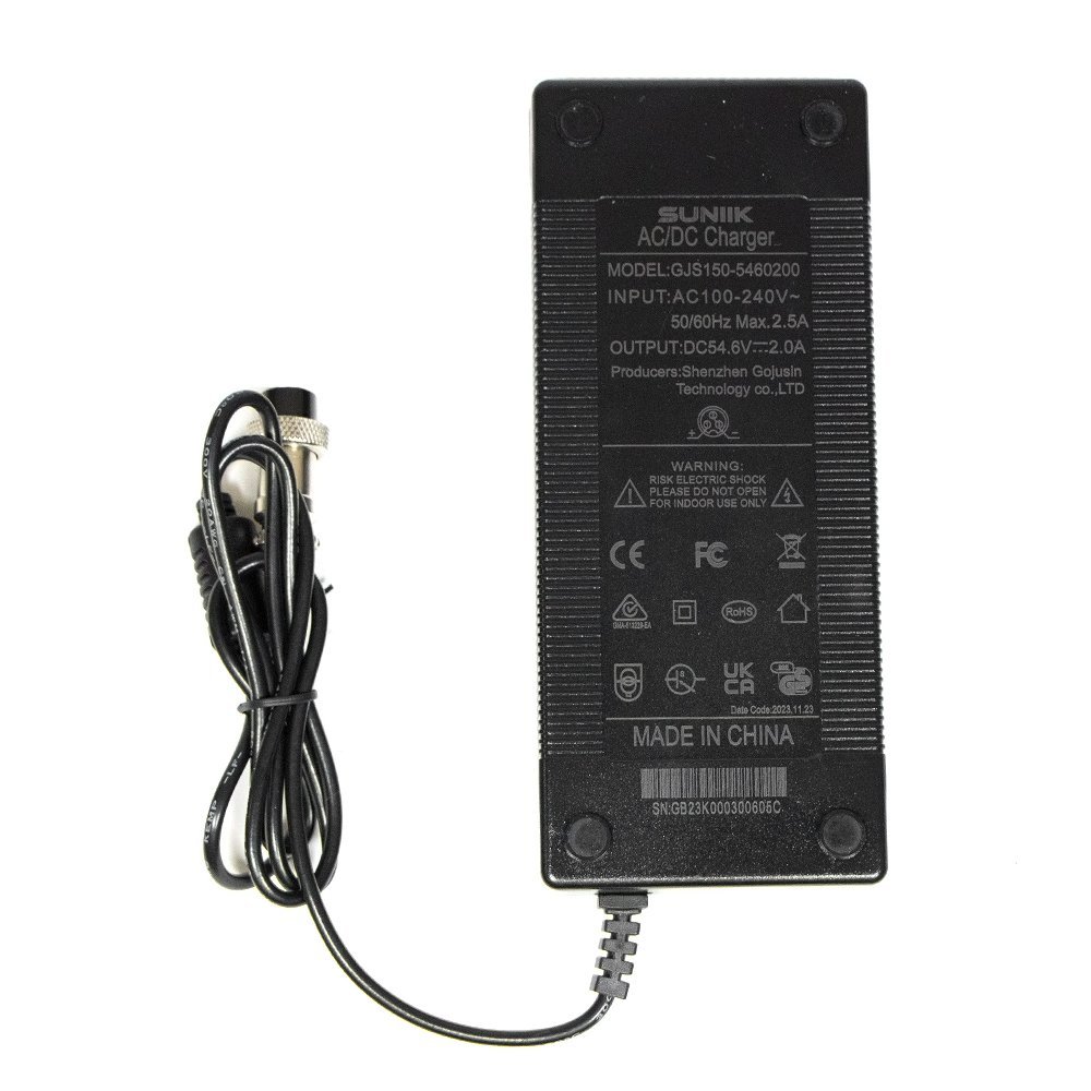 Con una salida de 54,6V y 2A, este cargador premium está equipado con un conector de 3 Pines GX16. Ofrece una carga fiable y segura para dispositivos eléctricos compatibles, proporcionando una solución efectiva para mantener tus equipos operativos con un rendimiento óptimo.