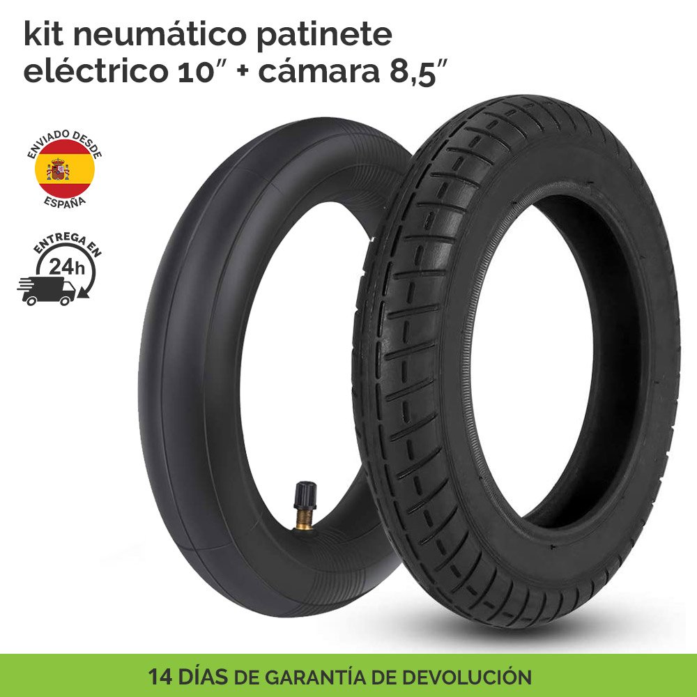 - Neumático para patinete eléctrico de 10″ + cámara 8,5″. El diseño reforzado de la cámara reduce la posibilidad de tener pinchazos.