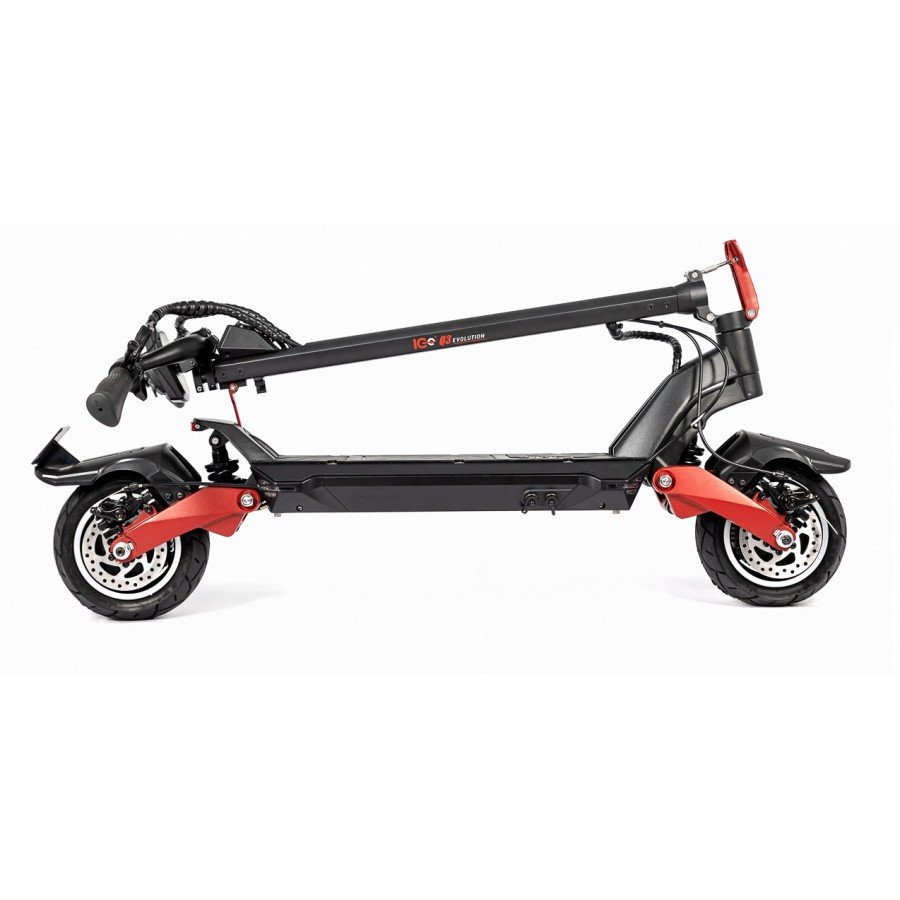 5.- Plegado: El ICe Q3 Evolution destaca por su robustez y estabilidad, con un mástil extra reforzado para una conducción segura y firme. El sistema de plegado, rápido, práctico y sencillo te permitirá tenerlo listo para ser transportado en cuestión de segundos. Dispone de un sistema de seguridad donde para desplegarlo solo deberás bajar la pestaña lateral de la propia pestaña de plegado, bajar el manillar y a continuación una vez tenemos el patinete plegado, cuenta con un sistema de bloqueo del mástil para sujetar la barra del manillar con la base del mismo para que sea todavía más sencillo transportarlo.